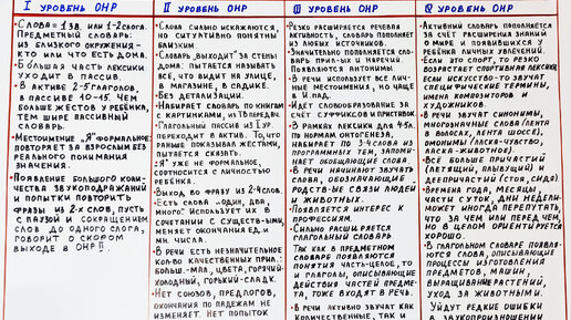 В помощь родителям составила краткий обзор лексики по четырем уровням общего недоразвития речи. В конце статьи поместила таблицу, которую можно распечатать и поглядывать в нее время от времени, чтобы определить, вышел ребёнок на следующий уровень развития речи или каким-то темам нужно уделить дополнительное внимание для расширения словарного запаса. Лексика 1-го уровня ОНР Появление большого количества звукоподражательных слов и попытки повторить фразы из двух слов, пусть с паузой и сокращением слов до одного слога, говорит о скором выходе в ОНР 2...