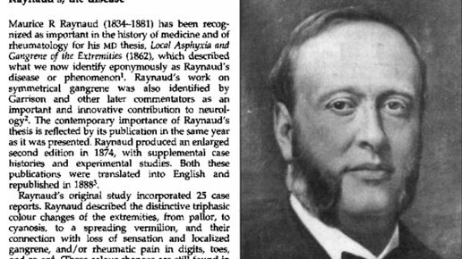 КТО ТАКОЙ МОРИС РЕЙНО? Позвольте представить: Морис Огюст Габриэль Рейно (1834 –1881), французский врач, ученый и настоящий пионер медицины. В 1862 году, в возрасте всего 28 лет, Рейно описал и систематизировал симптомы странного заболевания, которое вызывало резкое побеление и онемение пальцев рук и ног под воздействием холода или стресса. Он первым заявил, что это не просто «плохое кровообращение», а самостоятельное заболевание, вызванное внезапным спазмом сосудов. Доктор одним из первых указал на то, что сильные эмоции и стресс могут быть триггером приступа спазма сосудов...