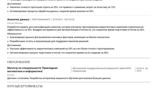 Пример резюме специалиста по машинному обучению — ваш главный помощник в составлении конкурентного CV. Изучите готовый материал, чтобы быстро создать резюме, которое приведет вас к офферу. 👋 На этой странице вы найдете готовые примеры резюме специалиста по машинному обучению для разных уровней и подробные пошаговые инструкции по каждому разделу: . Мы рассмотрим, как учесть актуальные требования работодателей и правильно адаптировать резюме под вакансию. Эти материалы помогут как начинающим, так и опытным специалистам по машинному обучению...