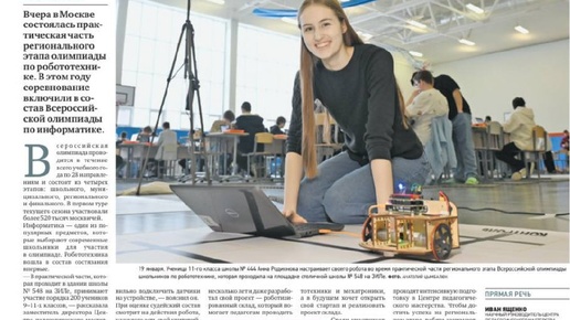 » 📰 🌟 Газета «Вечерняя Москва» в своем номере от 20 января написала об успехах московских школьников на региональном этапе Всероссийской олимпиады по робототехнике! И среди героев материала — Анна, наша ученица 11 «космического» класса школы № 444. 💢 На работу — написание кода, подключение датчиков и программирование роботов для работы — участникам олимпиады было дано три часа. 🗯 Анна, увлекшаяся робототехникой в 10-м классе, уже показывает впечатляющие результаты....