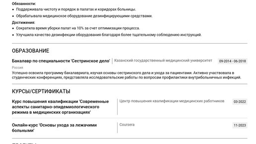 Пример резюме санитарки поможет вам изучить готовые примеры, чтобы составить действительно эффективное резюме. Используйте наши рекомендации, чтобы быстро найти работу. ✨ Чтобы успешно пройти отбор, важно знать, как составить резюме, которое заинтересует работодателя. На этой странице вы найдете Эти инструкции и примеры будут полезны как начинающим, так и опытным специалистам в этой сфере. Изучив пример, вы сможете создать резюме с помощью нашего конструктора резюме. Заголовок резюме – это первое, что видит работодатель...