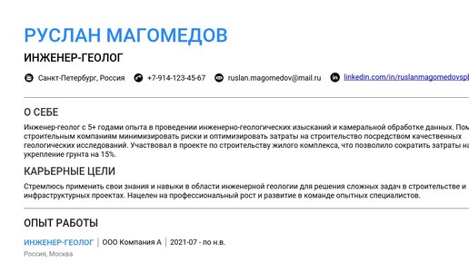 Изучите пример резюме инженера-геолога, чтобы быстро и эффективно составить свой документ. Это ваш шаг к успешному поиску работы в сфере геологии! 🗺️ Здесь вы найдете не просто готовый набор данных, а пошаговые инструкции и готовые примеры для каждого раздела вашего резюме: Эти рекомендации помогут создать документ, подходящий как для начинающих, так и для опытных специалистов в области геологии. Изучив пример, вы сможете создать резюме с помощью нашего конструктора резюме. Заголовок резюме – это...