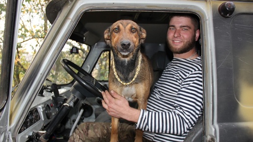 С Семеном, бойцом ремонтного подразделения Министерства обороны РФ с позывным «Саймон», удалось связаться по телефону. Договорились о встрече. Подъезжая к месту дислокации, услышал громкий лай, а потом и увидел саму собаку: небольшую дворняжку коричневого окраса с длинным носом и широким, золоченым ожерельем на шее. Она подскочила ко мне, села и подняла голову. Широко раскрыв пасть, будто добродушно улыбалась, оглядываясь на хозяина. Подошел Семен, протянул руку и тоже искренне улыбнулся. Я посмотрел на эту пару – человека и животного – и порадовался за них...