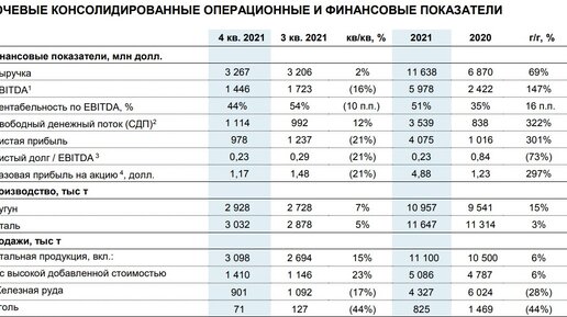 Северсталь отчиталась за 2021 год, вот основные показатели (скрин из пресс-релиза): Отчетный год был для компании рекордным по всем основным финансовым показателям: выручке, EBITDA и чистой прибыли. Причем прирост показателей год к году впечатляющий (можно посмотреть в последнем столбце таблицы выше). Все это результаты сказочно позитивной для отрасли черной металлургии ценовой конъюнктуры в 2021 году (которая явилась следствием регуляторных изменений в Китае и супермягкой монетарной политики мировых центральных банков)...