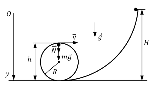 Полное условие задачи Шарик скользит без трения по наклонному желобу, а затем движется по «мертвой петле» радиуса R. С какой силой давит шарик на желоб в верхней точке петли, если масса шарика 100 г, а высота, с которой его отпускают, равна 4R, считая от нижней точки петли. Краткое условие задачи Решение задачи Запишем второй закон Ньютона для шарика, находящегося в верхней точке петли, в векторном виде: Перепишем его в проекциях...