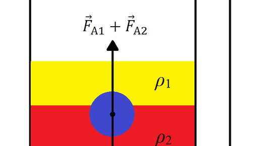 Полное условие задачи Краткое условие задачи Решение задачи Запишем второй закон Ньютона для шарика: Перепишем в проекциях на ось OY: или Силы Архимеда найдем по следующим формулам: Силу тяжести определим следующим образом: где тогда Получаем: или Части объема шарика, находящихся выше и ниже границы раздела жидкостей,...