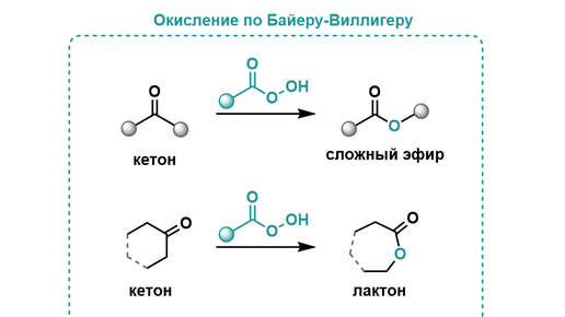 Окисление по Байеру-Виллигеру – органическая реакция, которая позволяет преобразовывать ациклические кетоны в соответствующие сложные эфиры (циклические кетоны – в лактоны). В качестве окислителя в данной реакции используются надкислоты (пероксокислоты) или органические пероксиды