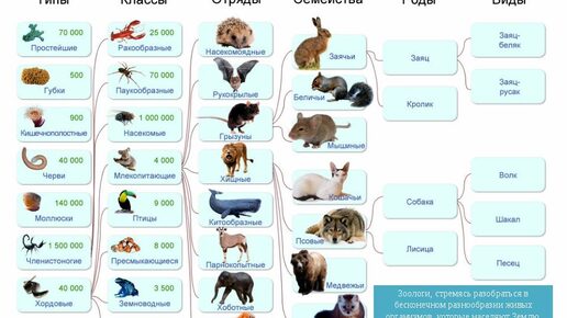 Чтобы разобраться в невообразимом количестве организмов, биологи используют систему классификации, которая включает многоуровневые ранги (группы), объединяющие животных на основе их сходства. *Систематика — это наука, которая занимается классификацией и описанием организмов - как живых, так и вымерших. Систематика животных включает следующие группы: Рассмотрим их подробнее. Всего в биологии выделяют 4 царства: животные, растения, грибы и бактерии. Мы рассмотрим конкретно царство животных. *Таксон — это группа в классификации, объединенная общими свойствами и признаками...