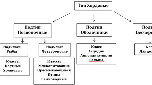 Мы полностью прошли беспозвоночных животных, и начнём изучение очень обширного и разнообразного типа животных - Хордовые. Тип Хордовые - тип вторичноротых животных, для которых характерно наличие энтодермального осевого скелета (хóрды) . Делится на данную систематику: