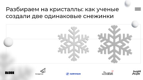 Снежинка — снежный или ледяной кристалл, выпадающий в виде атмосферных осадков. Вопреки законам физики она обладает шестиугольной формой (хотя должна быть треугольной — это зависит от угла молекулы воды). Работает это следующим образом: влажность воздуха повышается, температура понижается, молекулы воды замедляются, и превращаются в кристалл. Физик Джон Нельсон выяснил, что число возможных типов снежных кристаллов равно примерно единице с 768 нулями. Их формирование начинается одинаково — с появления шарика льда вокруг пылинки...