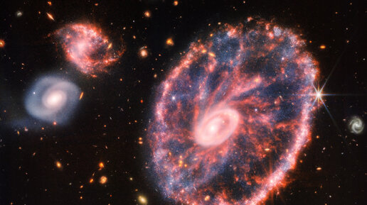 Телескоп «Джеймс Уэбб» запечатлел галактику «Колесо телеги» (ESO 350-40), которая находится на расстоянии около 500 миллионов световых лет от Земли в созвездии Скульптора. Помимо «Колеса телеги», фотография показывает две её меньшие галактики-компаньона. Галактика получила своё название из-за формы, возникшей в результате высокоскоростного столкновения между большой спиральной галактикой и меньшей галактикой, которой не видно на этом изображении. Столкновение галактик оказало большое влияние на форму и структуру «Колеса телеги»...