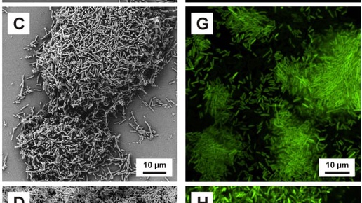 Выделяют пять стадий развития биоплёнки: 1) первичное прикрепление микроорганизмов к поверхности (адгезия, адсорбция) из окружающей среды (обычно жидкости, стадия обратима) А,E; 2) окончательное (необратимое) прикрепление (фиксация, на этой стадии бактерии выделяют внеклеточные полимеры, обеспечивающие прочную адгезию) B,F; 3) созревание - клетки, прикрепившиеся к поверхности, облегчают прикрепление последующих клеток, внеклеточный матрикс удерживает вместе всю колонию...