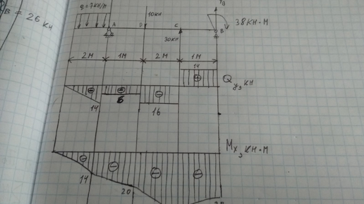 ( Если сила крутит балку по часовой стрелке, то она идет со знаком +, если против часовой, то с минусом) Важно отметить, что эта кривая в 38 Кн*м — уже момент...