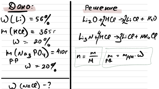 Условие: Смесь оксида лития и нитрида лития, в которой массовая доля атомов лития равна 56%, растворили в 365 г 20%-ной соляной кислоты. При этом образовался практически нейтральный раствор (процессами гидролиза пренебречь). К нему добавили 410 г 20%-ного раствора фосфата натрия. Вычислите массовую долю хлорида натрия в конечном растворе. 1. Запишем, что нам дано. На ЕГЭ по химии не обязательно записывать «дано», но я рекомендую это делать, чтобы не запутаться и более внимательно прочитать задачу 2...