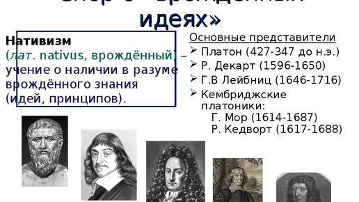 Врождённые идеи или иннатизм (лат. innātus «врожденный») — это представления и знания, которые не могут быть приобретены, поскольку они не имеют отношения к чувственному миру (напр., математические и логические аксиомы, нравственные начала). Истоки теории можно найти в концепции Платона «знании как припоминании» идей, которые душа будто бы созерцала до того, как она появилась на земле. Весь чувственный мир, по мнению Платона, есть порождение вечных, ни отчего не зависящих «идей». В каждом человеке,...