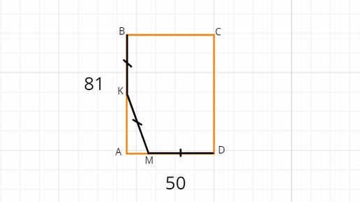 23. ★★☆ На сторонах AB и AD прямоугольника ABCD взяли точки K и M так, что BK=KM=MD. Найдите длину отрезка MK, если длины сторон прямоугольника равны 50 и 81. x=9 MK=41