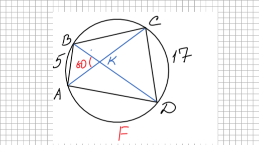 Здравствуйте, дорогие читатели, подписчики и гости канала. Рассмотрим решение 25 задачи ОГЭ по геометрии. Текст задачи Четырёхугольник ABCD со сторонами AB=5 и CD=17 вписан в окружность. Диагонали AC и BD пересекаются в точке K, причём угол AKB=60°. Найдите радиус окружности, описанной около этого четырёхугольника Решение: Почти любую задачу по геометрии нужно решать с того, что нужно найти. Запишем формулу для нахождения радиуса описанной окружности через теорему синусов: Теорема синусов применима для вписанного треугольника...