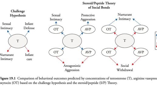 🦊Стероидно-пептидная теория социальных связей (С/П теория) основывается на классической гипотезе вызова (the Challenge Hypothesis) и объясняет парадоксы гормонального воздействия на поведение. Гипотеза вызова предполагала, что повышение тестостерона происходит только в условиях конкуренции для повышения репродуктивной приспособленности, например, при охране партнера, но его уровень снижается, когда необходимо проявить поведение, направленное на воспитание потомства и укрепление парных связей в отсутствие конкурентов...