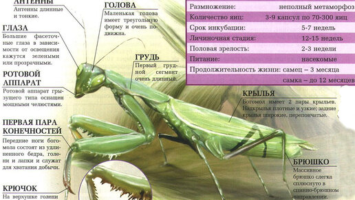 Как правило, у богомолов тело вытянутой формы, что является отличительной чертой этих насекомых. Богомолы – одни из немногих насекомых, которые могут совершить полный оборот головы вокруг ее оси. Именно поэтому они могут без проблем заметить врагов сзади. Ухо у насекомого лишь одно, однако слух у него отменный. У богомолов фасеточные глаза, которые располагаются с двух боков головы. Также есть три элементарных глаза над местом, где растут усики. Усы богомола, в свою очередь, гребенчатого строения, могут быть также перистыми и нитевидными...