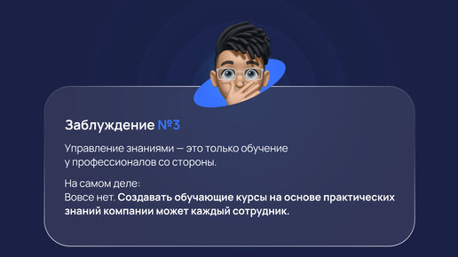 Управление знаниями — это только обучение у профессионалов со стороны. Вовсе нет. Обучение — всего лишь один из способов передать готовое знание. Этим занимаются обучающие платформы, где опытом делятся сторонние эксперты: Skillbox, Otus, GeekBrains. Даже если вы заплатите за обучение сотрудников, вы все равно не сможете управлять этими знаниями. Во-первых, у обучающих платформ массовые курсы, они не учитывают потребности конкретной компании. Например, в курсе “Проджект-менеджмент” нет блока о том, как в конкретной компании принято общаться с клиентами...