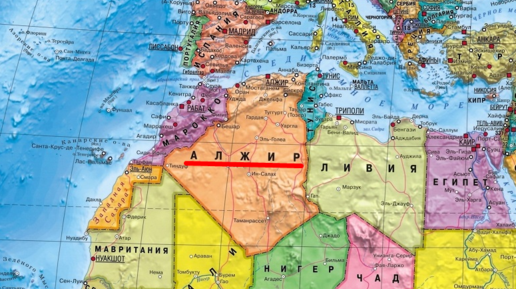 2)Географическое положение: Имеет выход к Средиземному морю. Соседи: Тунис, Ливия, Нигер, Мали, Мавритания, Западная Сахара, Марокко. Площадь страны - 2.381.741 км.кв.