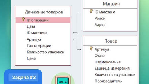 Условие: № 8939 (Е. Джобс) В файле приведён фрагмент базы данных «Продукты» о поставках товаров в магазины районов города. База данных состоит из трёх таблиц. Таблица «Движение товаров» содержит записи о поставках товаров в магазины в течение первой декады июня 2021 г., а также информацию о проданных товарах. Поле Тип операции содержит значение Поступление или Продажа, а в соответствующее поле Количество упаковок, шт. занесена информация о том, сколько упаковок товара поступило в магазин или было продано в течение дня...