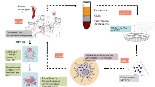 На первом этапе процесса пациенту проводят аферез периферической крови для получения популяции мононуклеарных клеток (CMN) in vitro. Затем в лаборатории проводится обработка периферической крови для выделения популяции CMN, состоящей из лимфоцитов и моноцитов. Затем из CMN получают посев дендритных клеток (CD) посредством инкубации с различными молекулами стимуляторами. На заключительных этапах посева CD инкубируются с простатической кислой фосфатазой (FAP) и различными молекулами созревания для получения посева CD специфических для FA P...