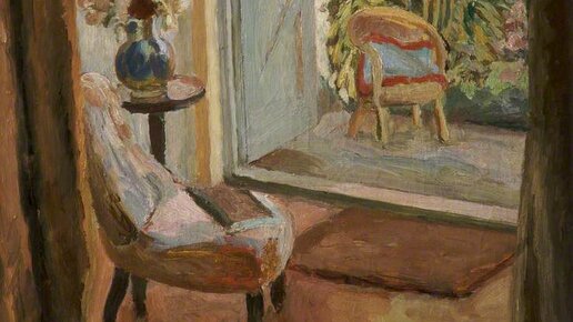Частично натюрморт, частично пейзаж, вот что представляет собой эта картина Ванессы Белл (годы жизни 1879-1961), которая изображает на себе частичный интерьер комнаты, включающей в себя стул, на котором зиждется книга; и столик с вазой, наполненной полевыми цветами. В центре и в правой части полотна находится отрытый дверной проём, через который можно лицезреть плетёное кресло, стоящее перед входом в пышный зелёный сад. Это одна из многих картин, созданных Белл, в которых в качестве декорации использовался её же собственный дом в Чарльстоне (графство Восточный Суссекс, Англия)...