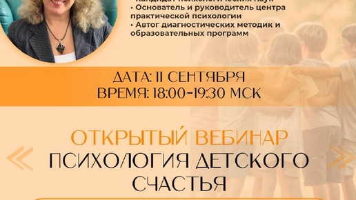 👆👆👆👆👆 Открытый вебинар «Психология детского счастья» 11 сентября 18:00–19:30 (мск) ✨Детство — это время открытий, радости и доверия. Задача родителей и специалистов — помочь ребёнку сохранить это чувство счастья и уверенности в себе. На вебинаре вы узнаете, как: ✅поддерживать эмоциональное развитие ребёнка...