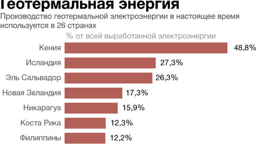 Производство геотермальной электроэнергии в настоящее время используется в 26 странах. Но для некоторых стран геотермальная энергия уже является одной из самых весомых в экономике. Кения это яркий пример, где для выработки почти половину всей электроэнергии используются геотермальные источники...