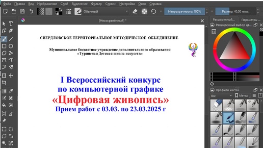 Информационное сопровождение С 03.03. по 23.03.2025 г. идет приём заявок I Всероссийского конкурса по компьютерной графике «Цифровая живопись». Цель и задачи конкурсного мероприятия: привлечение внимания к художественному творчеству в области компьютерной графики. Выявление творческого потенциала участников конкурса в области цифровой живописи; популяризация значимости и активизация внедрения компьютерной графики в систему художественного образования России. Формат Конкурса - дистанционный, два этапа...