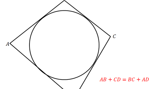 И снова здравствуйте! Сейчас поговорим об описанных 4-угольниках. Существует вероятность, что на экзамене они вам попадутся в каком-то из заданий. Предупрежден - значит вооружен. Когда вы в условии задачи прочитали, что какой-то четырехугольник описан около окружности (или окружность вписана в четырехугольник), то советую вспомнить это свойство: Если четырехугольник описан около окружности, то суммы двух противолежащих сторон этого четырехугольника равны...