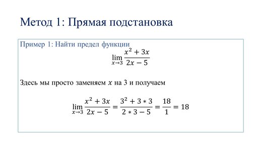 Вычисление пределов включает в себя множество методов, и в этой статье описаны некоторые из них. Самым простым методом является прямая подстановка. Однако такой метод не всегда работает. Ниже рассмотрим другие методы, которые можно использовать. Если есть квадратный корень в функции, то попробуйте умножить на сопряженное...
