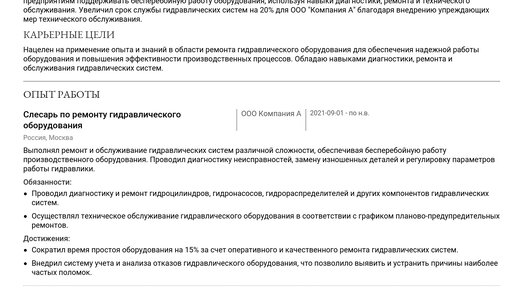 Пример резюме слесаря по ремонту гидравлического оборудования 2025