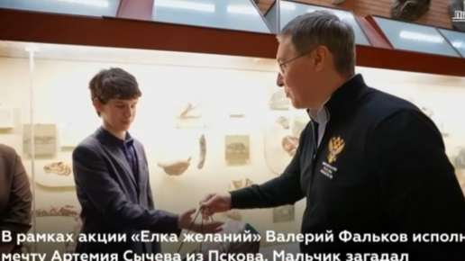 Желание псковского подростка исполнил министр науки и высшего образования России. 14-летний Артемий Сычев — участник всероссийской акции «Елка желаний». Артемий увлекается палеонтологией и мечтал встретиться с учеными. Его мечту осуществил министр науки и высшего образования России Валерий Фальков. Артемий, его мама и бабушка отправились в Палеонтологический музей имени Ю. А. Орлова в Москве...