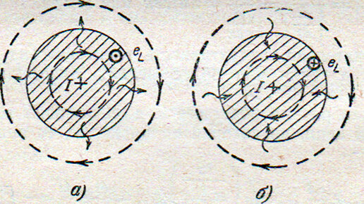Для школьников. Знать сущность явления самоиндукции очень важно для понимания процессов, происходящих в цепях переменного тока. Поясним, что происходит с магнитным полем, когда ток в проводнике растёт или уменьшается, почему возникает ЭДС самоиндукции. Штриховкой обозначено сечение проводника, а знак "плюс" говорит о том, что ток направлен от нас (мы видим хвостик стрелки). Когда ток в проводнике увеличивается (рисунок слева), то магнитное поле вокруг него усиливается, то есть растёт количество магнитных силовых линий, окружающих проводник...