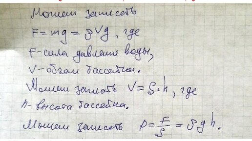 Прямоугольный бассейн с площадью дна S= 250 м2 глубиной h= 4 м наполнен водой. Каковы давление P и сила F, с которой вода давит на дно