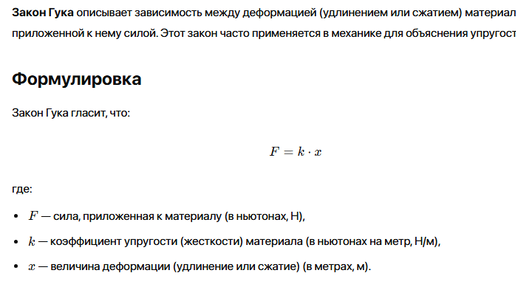 Закон Гука описывает зависимость между деформацией (удлинением или сжатием) материала и приложенной к нему силой. Этот закон часто применяется в механике для объяснения упругости тел. Закон Гука гласит,...