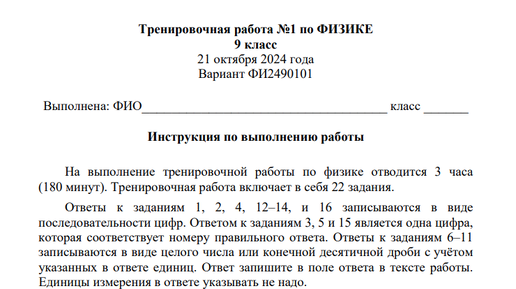 Тренировочная работа №1 статград по физике 9 класс в формате ОГЭ 2025 года тренировочные варианты ФИ2490101, ФИ2490102, ФИ2490103, ФИ2490104 с ответами и решением для подготовки к экзамену дата проведения пробника 21 октября 2024. Варианты заданий: скачать Ответы и решения: скачать На выполнение тренировочной работы по физике отводится 3 часа (180 минут). Тренировочная работа включает в себя 22 задания. Ответы к заданиям 1, 2, 4, 12–14, и 16 записываются в виде последовательности цифр. Ответом к заданиям 3, 5 и 15 является одна цифра, которая соответствует номеру правильного ответа...