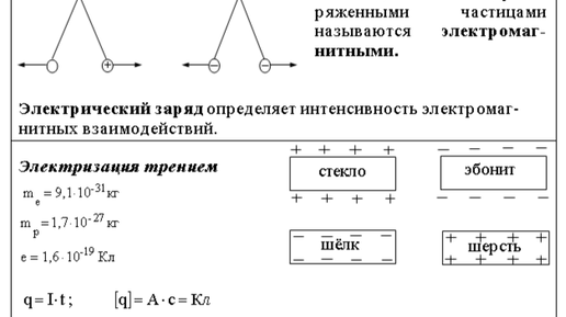 Электрический заряд Определение Электрический заряд — это физическая величина, которая описывает способность частиц взаимодействовать через электромагнитные силы. Существуют два типа электрических зарядов: • Положительный заряд (например, у протонов) • Отрицательный заряд (например, у электронов) Основные свойства: 1. Отталкивание и притяжение: Частицы с одинаковым зарядом отталкиваются, а с различными зарядами — притягиваются. 2. Единица измерения: В системе СИ электрический заряд измеряется в кулонах (C)...