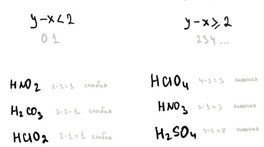 Это работает только в кислородсодержащих неорганических кислотах (!) Посмотрите на картинку. Общая формула кислоты HxROy, вычитая из количества кислорода водород получается цифра. Если она 0, 1 - кислота слабая, если 2, 3 и больше - сильная. Например редкая кислота HClO₄, у неё четыре кислорода и один водород...