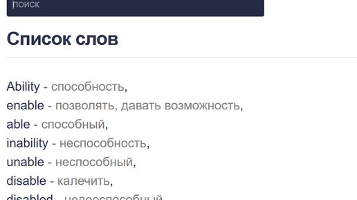 Список однокоренных слов: ABLE (прилагательное) - способный UNABLE (прилагательное) - неспособный ABILITY (существительное) - способность INABILITY (существительное) - неспособность ENABLE (глагол) - давать...