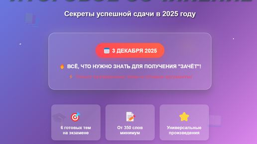 📅 3 декабря 2025 года одиннадцатиклассники снова сядут за парты, чтобы написать итоговое сочинение – важнейший допуск к ЕГЭ. Чтобы справиться с ним спокойно и уверенно, важно заранее понимать структуру, формат и возможные темы. Формулировка на экзамене будет следующей: ✏️ Выберите только одну из предложенных тем. Перепишите её в бланк и напишите сочинение-рассуждение. Объём – от 350 слов. Если менее 250 – «незачёт». Каждый выпускник получит 6 тем, но выбрать нужно будет одну. Сами формулировки – из закрытого банка, они заранее нигде не публикуются, поэтому на экзамене вы увидите их впервые...