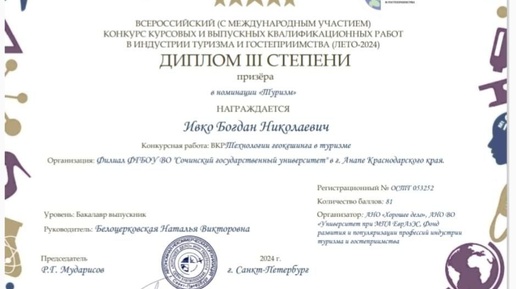 🔝Выпускники филиала Сочинского государственного университета в г. Анапе приняли участие во Всероссийском (с международным участием) конкурсе курсовых и выпускных квалификационных работ в индустрии туризма и гостеприимства. Конкурс проходил в рамках проекта «Глобальное образование: индустрия туризма и гостеприимства». Организаторы конкурса - АНО «Хорошее дело», АНО ВО «Университет при МПА ЕврАзЭС, Фонд развития и популяризации профессий индустрии туризма и гостеприимства, г...