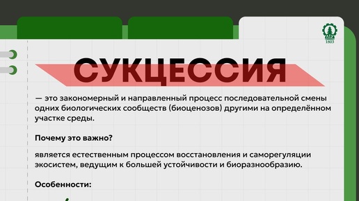 💡Добро пожаловать в рубрику «Глоссарий СПБГЛТУ»! 🌿 Сегодня мы поговорим о сукцессии. Это последовательная, закономерная смена одних биологических сообществ другими на определённом участке среды. Но вот случайный факт, который вас удивит: Сукцессия — это не только про растения! Меняющееся сообщество флоры напрямую влияет на фауну, почвенные микроорганизмы и даже на химический состав грунтовых вод...
