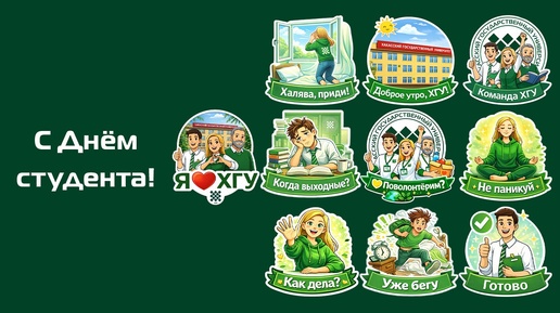😍 В честь Дня российского студенчества пресс-служба Хакасского госуниверситета подготовила для студентов подарок – фирменные стикеры для общения. Этот набор из 12-ти виртуальных наклеек в единой стилистике стал замечательной альтернативой эмодзи и поможет оживить переписку в Телеграме, а также закрепить в памяти бренд ХГУ. Основой для стикеров был выбран корпоративный тёмно-зеленый цвет, что придает им узнаваемость и связывает их с брендом ХГУ. Набор содержит символику вуза, добрые пожелания и мотивирующие фразы...