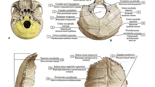 Затылочная кость - оs occipitale, образует задний отдел мозгового черепа; в ее центре проходит большое отверстие, foramen magnum, которое сообщает полость черепа с позвоночным каналом. Она состоит из базилярной и латеральных частей, а также затылочной чешуи. 1. Базилярная часть, pars basilaris: - скат, clivus, расположен на внутренней поверхности; - глоточный бугорок, tuberculum pharyngeum, находится на наружной поверхности; является местом прикрепления свода глотки. 2. Латеральная часть, pars lateralis,...