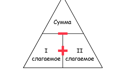Находим компоненты суммы, разности, произведения и частного. Для этого обратимся к схемам-треугольникам. По ним можно можно находить компоненты действий. Как пользоваться схемами - треугольниками. Закрываем ту часть треугольника, которую необходимо найти. Смотрим оставшиеся компоненты и какой стоит знак между ними, по этим данным и находим нужный компонент. Схемы "читаем" сверху вниз. Например, необходимо найти I слагаемое, закрываем его, остается сумма и II слагаемое, а также между ними знак "минус", следовательно I слагаемое = из суммы вычесть II слагаемое...