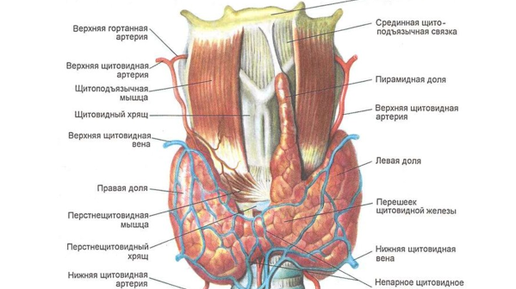 Щитовидная железа (glandula thyroidea) – непарная, самая крупная из желез внутренней секреции и единственный орган, синтезирующий органические вещества, содержащие йод. Располагается в переднем отделе шеи между щитовидным хрящом и 5-6-м кольцами трахеи. Имеет форму подковы и состоит из двух долей: правой доли (lobus dexter) и левой доли (lobus sinister), которые соединены перешейком (isthmus glandulae thyroideae). Иногда встречаются добавочные щитовидные железы (glandulae thyroideae accesssoriae)...