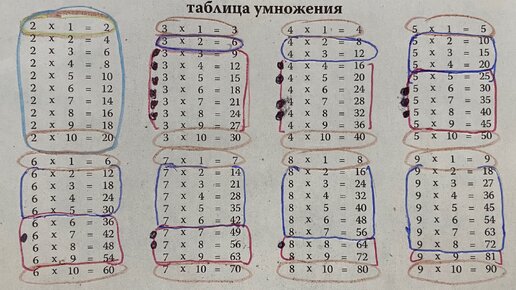Таблица умножения выглядит угрожающей. Почти у всех детей на фразу "Выучить" одинаковая реакция: "Воот этооо воот всё?!" И плохо запоминается, потому что так тяжело учить что-то огромное и неподъемное. А маленькое и легкое учить гораздо легче. Покажите ребенку, что таблица умножения на самом деле простая и маленькая - и он отлично выучит ее целиком за несколько дней. Смотрите, как просто разрисовать эту огромную таблицу, чтобы ребенок увидел, что она крошечная и очень лёгкая. Берем таблицу умножения с обратной стороны тетради, и двигаемся в следующем порядке...
